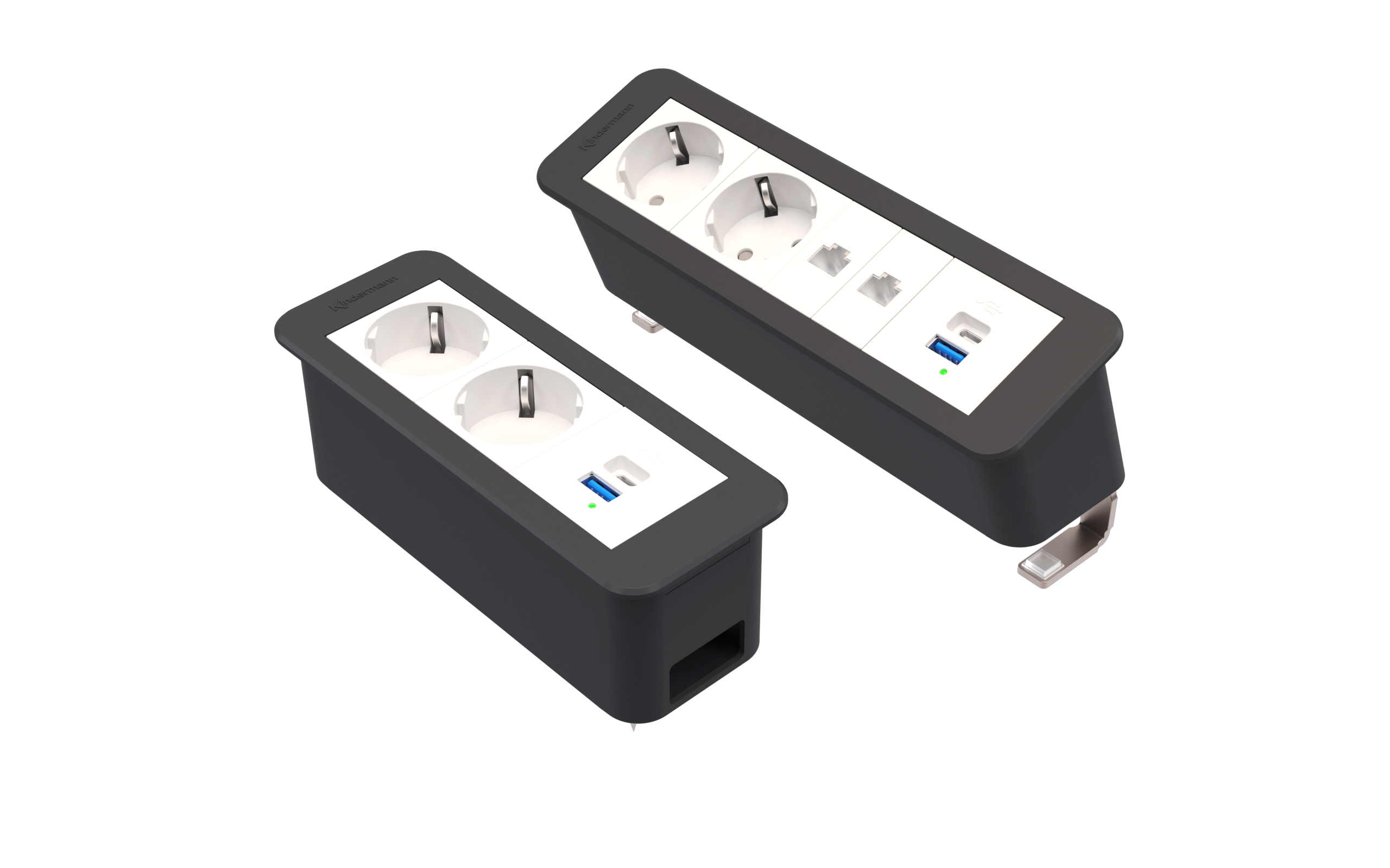 Erstmals kommen auch moderne USB-Charger mit USB Power Delivery und Quick Charge in den Tischanschlussfeldern von Kindermann zum Einsatz. Der Ladestrom von bis zu 30 W sorgt bei Notebooks, Tablets und Smartphone schnell für volle Akkus.