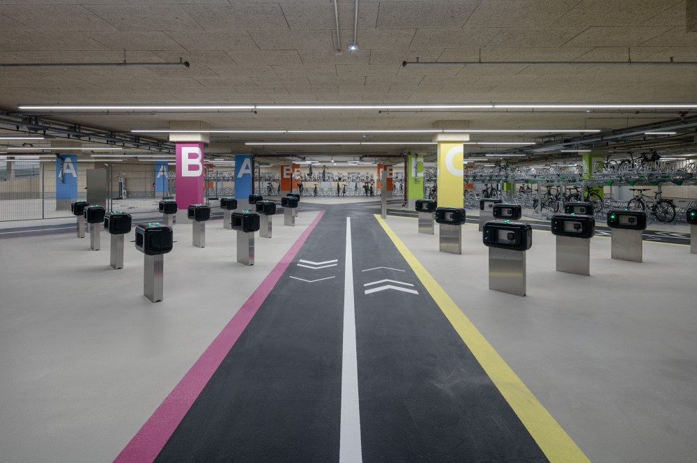 Hell, sicher, komfortabel: die Drive-in-Fahrradgarage im Dstrct.Berlin. Abbildung: HGEsch Photography