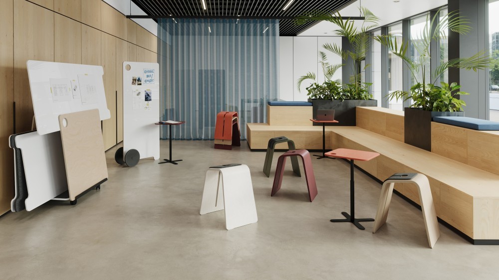 Show­time von Renz: Die Serie besteht aus Hockern sowie magne­ti­schen und beid­sei­tig beschreib­ba­ren White­boards, die auch mit Rol­len ver­füg­bar sind. Ein höhen­ver­stell­ba­rer Bei­stell­tisch sowie der Trans­port- und Prä­sen­ta­ti­ons­wa­gen kom­plet­tie­ren das Set für krea­ti­ve Mee­tings. Mobil, fle­xi­bel und mit gerin­gem Gewicht ide­al für agi­le Teams und spon­ta­ne Kreativtreffen.