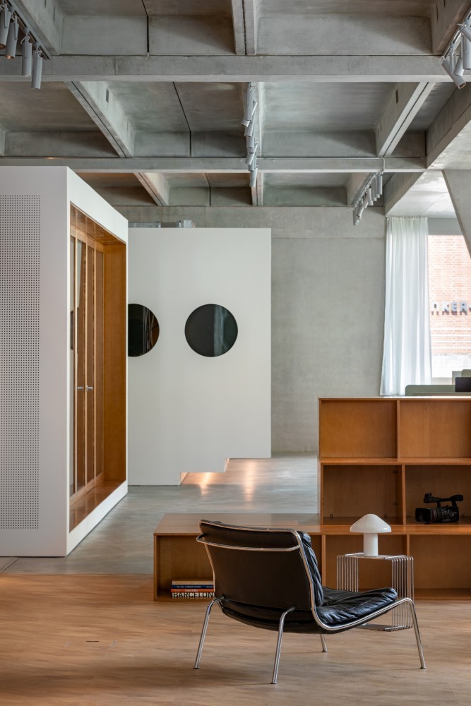 Im Sommer 2024 bezog die Filmproduktionsfirma Dynamic Frame ihre neuen Büroflächen im Erdgeschoss eines architektonisch ungewöhnlichen, terrassenförmigen Neubaus von EM2N Architekten im Zürcher Stadtteil Binz. Das ehemalige Industrieareal hat sich in den letzten Jahren in ein lebendiges Kreativareal verwandelt. Viele der Oberflächen im Innenraum beließ das von Dynamic Frame beauftragte Architekturbüro balbek bureau im veredelten Rohzustand mit vielen Sichtbetonoberflächen und einem grauen, geschliffenen Zementestrich als Fußboden. Lediglich der zentrale Loungebereich, der für Teammeetings oder als Rückzugsraum genutzt werden kann, hebt sich mit seinem eleganten Parkettboden bewusst vom Gesamtbild ab und setzt einen wohnlichen, warmen Rahmen für die besondere Nutzung.