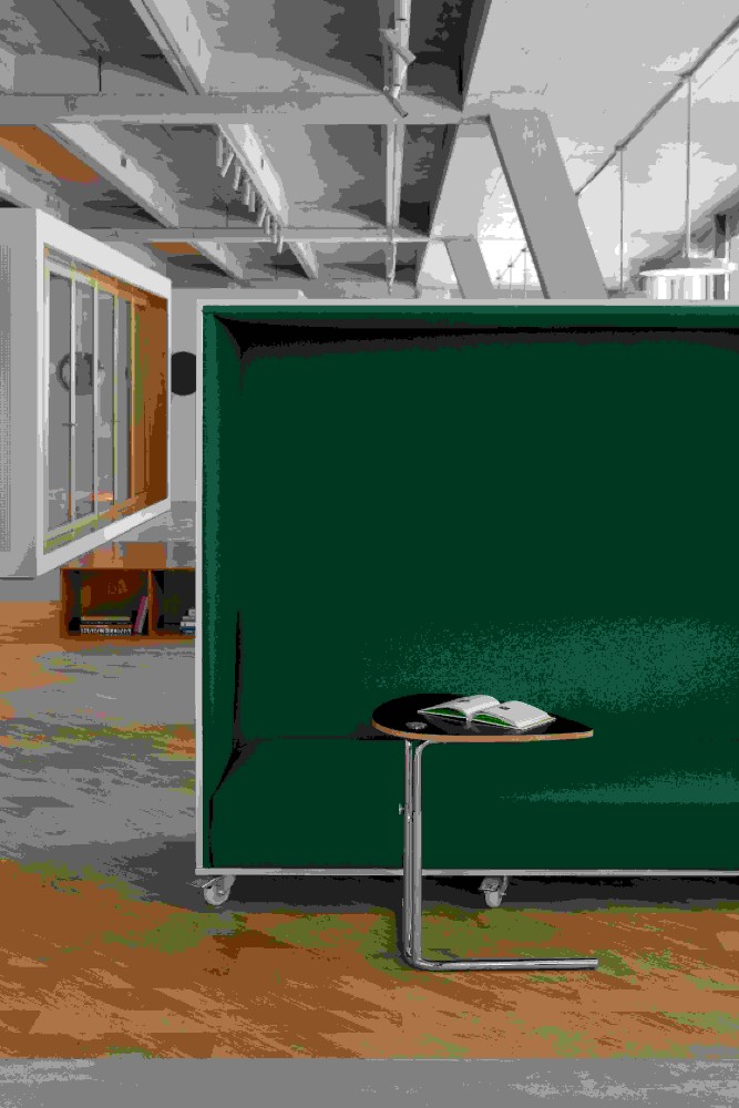 Der Loungebereich wird durch ein naturgeöltes Eichenparkett betont, das einen warmen Akzent in der ansonsten grauen Zementestrich-Bodenfläche setzt. Gestaltet wurde die Fläche mit der Kollektion Spinpark des Schweizer Herstellers Bauwerk Parkett. Verlegt als klassischer Schiffsboden überrascht die rund 40 m2 große Echtholzfläche mit einem ungewöhnlichen, dynamischen Auftritt. Erzielt wird dies über die diagonal zur Verlegerichtung verlaufende Maserung. Mit der Drehung der Holzmaserung um 45 Grad zur Diele lässt Spinpark, entworfen vom Schweizer Architektur- und Designstudio atelier oï, völlig neue Fußbodenoptiken entstehen.