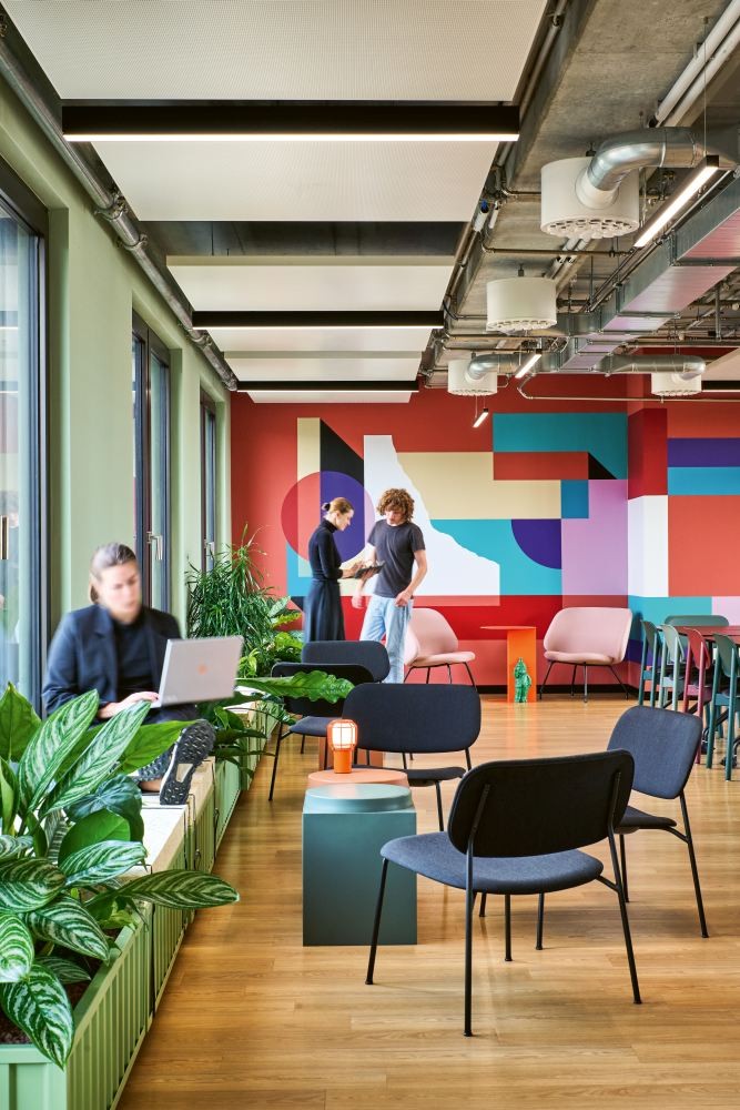 blocher partners entwickelte ein modulares Konzept, das Räume als Bühne für Veränderung versteht. Die Flächen sind farblich zoniert – jede Etage steht für einen Berliner Aspekt: von Goldelse bis Philharmonie. Urbanes Flair entsteht durch den Einsatz von Materialien wie Beton, Metall und Street Art – ergänzt durch kreative Tape-Art des Kollektivs „Tape That!“. Flexible Möbel, Ready-mades und rohe Elemente ermöglichen eine Arbeitsumgebung, die sich den Bedürfnissen anpasst. Ob Klapptische, Sofas oder offene Flächen – das Büro