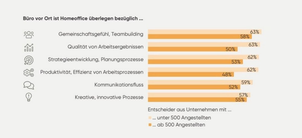Für viele Betriebe ist das Büro der soziale Ankerpunkt im Arbeitsalltag. Ganz besonders punktet es beim Zwischenmenschlichen: 66 Prozent der Mittelständler bestätigen, dass Mitarbeiterführung im Büro besser funktioniert als im Homeoffice. Gleiches gilt für den gezielten Kommunikationsfluss und spontane Gespräche (59 Prozent). Bei Großunternehmen fallen diese Werte traditionell niedriger aus.