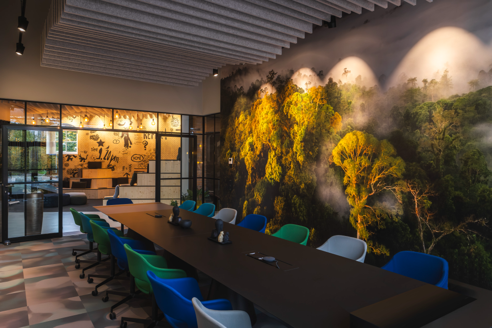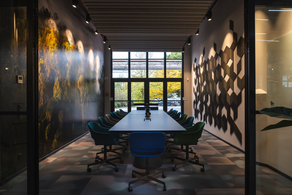 Strategische Weitsicht: Konferenzraum, der mit Naturmotiven und Akustikelementen Konzentration und Kreativität fördert. Abbildung: Maximilian Heinsch