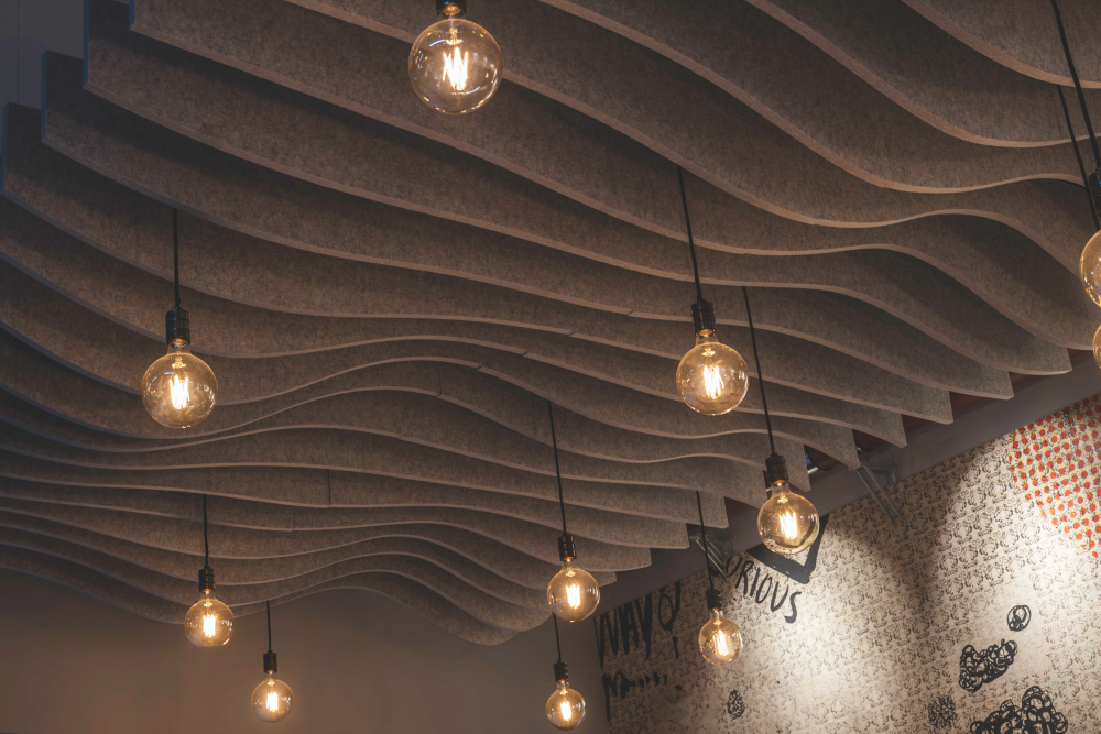 Dynamische Akustikdecke mit warmem Licht: Wellenförmiges Design optimiert die Akustik und schafft eine ruhige Atmosphäre. Abbildung: Maximilian Heinsch
