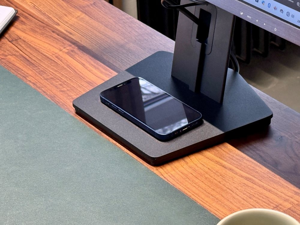 Auch zum Laden des Smartphones ist kein Kabel am Schreibtisch nötig: In den Standfuß ist eine Ladefläche integriert. Abbildung: Concept International
