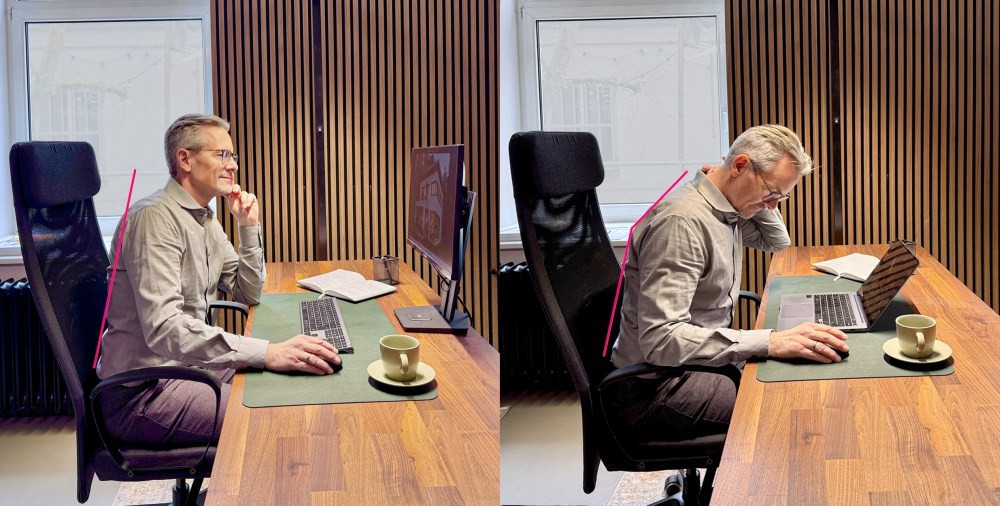 Gesun­de Kör­per­hal­tung: Am Future­AIO bleibt der Rücken gera­de (li.), am Lap­top wird es oft schmerz­haft (re.). Abbil­dung: Con­cept International