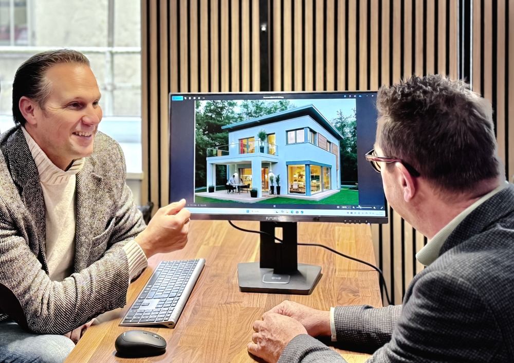 Chris­toph Bei­er­kuhn­lein (li.) nutzt den fast kabel­lo­sen Future­AIO mit Touch­screen gern im Kun­den­ge­spräch auf Augen­hö­he. Abbil­dung: Con­cept International