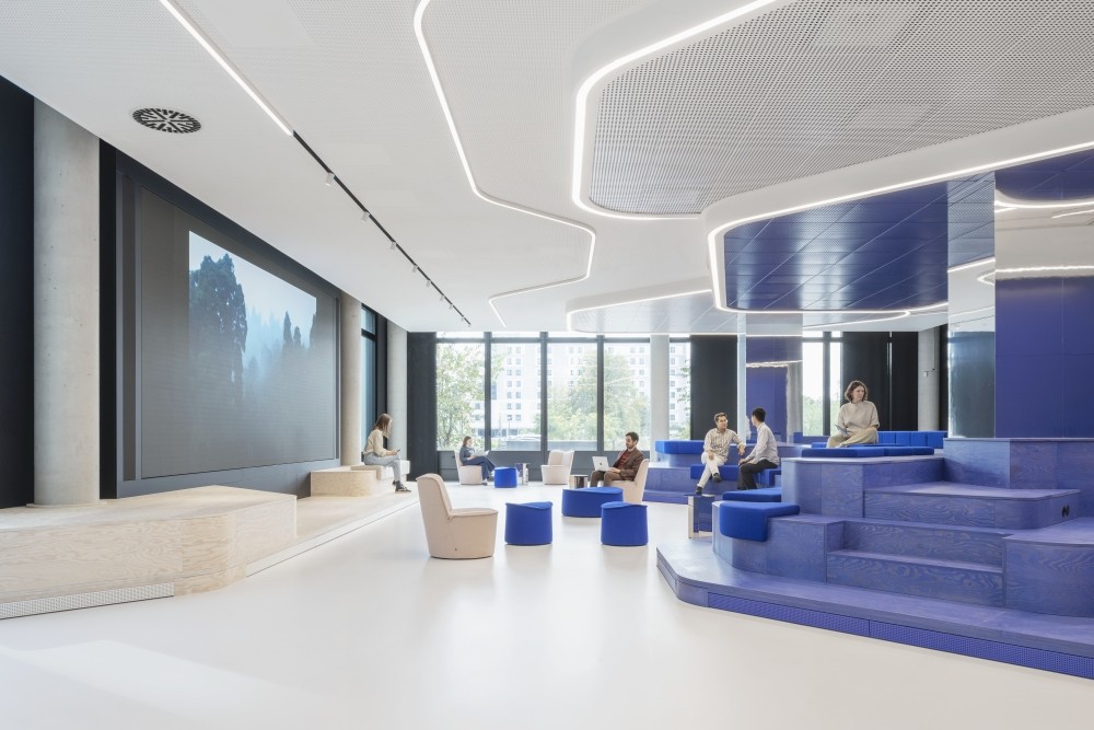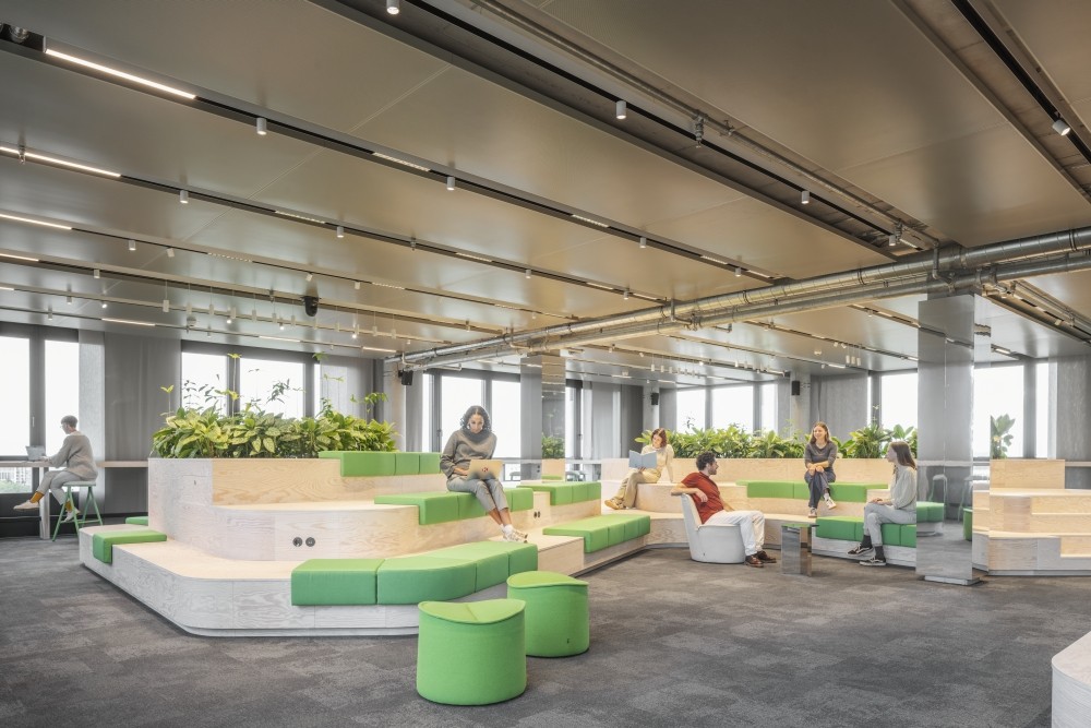 Auf einer Fläche von rund 24.000 m2 bestimmen vor allem Gemeinschafts- und Kollaborationszonen sowie Kommunikationsbereiche das Bild. Chefbüros sowie klassische Einzel- und Doppelbüros gehören der Vergangenheit an. Transparenz und Flexibilität stehen nun im Mittelpunkt. Die flachen Hierarchien spiegeln sich in den offenen Raumstrukturen wider. Diese sind in verschiedene Bereiche aufgeteilt, die auf die unterschiedlichen Tätigkeiten und Arbeitsschwerpunkte der Mitarbeitenden abgestimmt sind und gleichzeitig agiles Arbeiten fördern. Zudem gibt es Fokusarbeitsplätze, Projekt- und Rückzugsräume. Selbst die Cafeteria lädt zum Arbeiten und Austauschen ein.