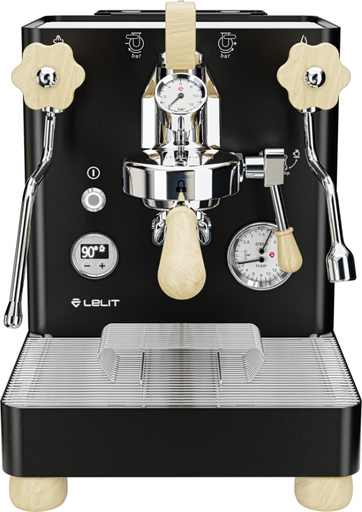 Bianca von Lelit: Kaffeekenner können bei dieser Siebträgermaschine den Wasserdurchfluss, den Extraktionsdruck und die Temperatur nach eigenen Vorlieben gezielt anpassen und so den gesamten Zubereitungsprozess exakt kontrollieren. Die Bedienelemente lassen sich individualisieren: Drehknöpfe, Hebel, Paddle und Füße sind in verschiedenen Holzarten erhältlich.