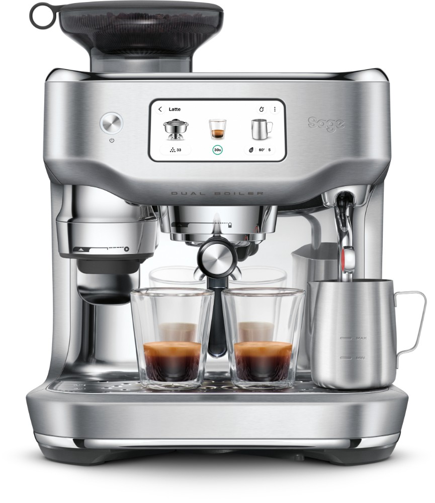 Oracle Dual Boiler von Sage Appliances: Diese Espressomaschine vereint Komfort mit Barista-Kunst. Im Auto-Modus übernimmt sie die gesamte Zubereitung – vom Mahlen über Tampern und Brühen bis zum cremigen Milchschaum. Der große Touchscreen führt Schritt für Schritt durch den Prozess. Wer die Barista-Kunst selbst erleben möchte, wechselt einfach in den manuellen Modus.