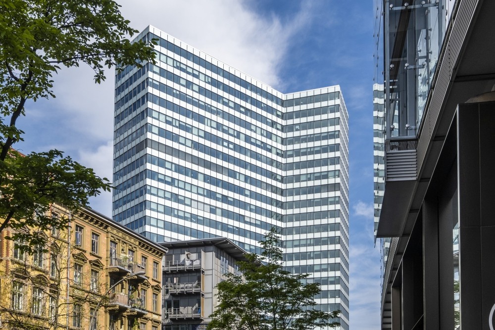Die Grund­la­ge des Umbaus bil­de­te eine detail­lier­te Bestands­ana­ly­se, die die archi­tek­to­ni­schen Beson­der­hei­ten des denk­mal­ge­schütz­ten Hoch­hau­ses und die Nut­zer­be­dürf­nis­se berück­sich­tig­te. Das Kon­zept pro­fi­tier­te von der Grund­riss­struk­tur des Gebäu­des: Die lang gezo­ge­nen Recht­ecke, die um einen zen­tra­len Erschlie­ßungs­kern ange­ord­net sind, ermög­li­chen viel­sei­ti­ge Nut­zungs­sze­na­ri­en. Die Büro­land­schaft wur­de nach den Pla­tin­kri­te­ri­en der DGNB umge­setzt. Bei der Aus­wahl der Her­stel­ler wur­den neben Schad­stoff­er­klä­run­gen auch Infor­ma­tio­nen zu fai­ren Lie­fer­ket­ten und Trans­port­we­gen ein­ge­holt. Dies erwies sich als her­aus­for­dernd, da Trans­pa­renz zu Nach­hal­tig­keits­fak­to­ren von Bau­pro­duk­ten noch kein bran­chen­über­grei­fen­der Stan­dard ist.