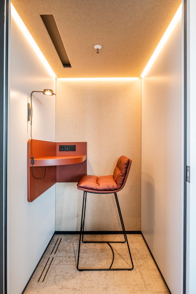 Der Think Tank setzt einen markanten Farbakzent und schafft zugleich einen Rückzugsort für ungestörte Gespräche. Abbildung: Arnt Haug