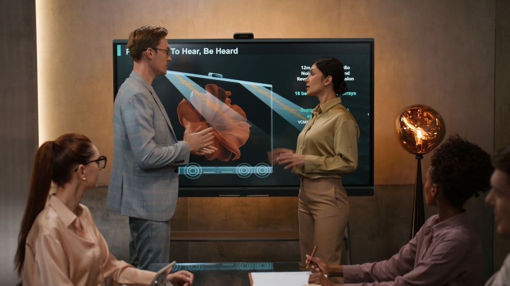 Die audiovisuelle Qualität ist ein zentraler Erfolgsfaktor hybrider Meetings. Hall, Nebengeräusche oder starre Kameraperspektiven stören den Gesprächsfluss. Moderne Kamera- und Audiosysteme schaffen eine natürliche und gleichwertige Gesprächsatmosphäre für alle Beteiligten. Hochauflösende Kameras mit automatischer Sprechererkennung richten sich gezielt auf die aktive Person, während intelligente Bildausschnitte und 360°-Erfassung sicherstellen, dass niemand aus dem Fokus gerät. Beamforming-Technologie, Sprecherlokalisierung sowie Echo- und Geräuschunterdrückung sorgen gleichzeitig für eine klare Sprachübertragung. So bleibt die Aufmerksamkeit bei den Inhalten, nicht bei Technikproblemen.