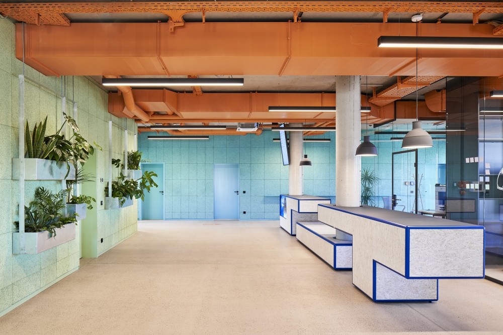 Farbenfrohe, akustisch wirksame Gestaltung des Rohbaus. Abbildung: Lennart Wiedemuth