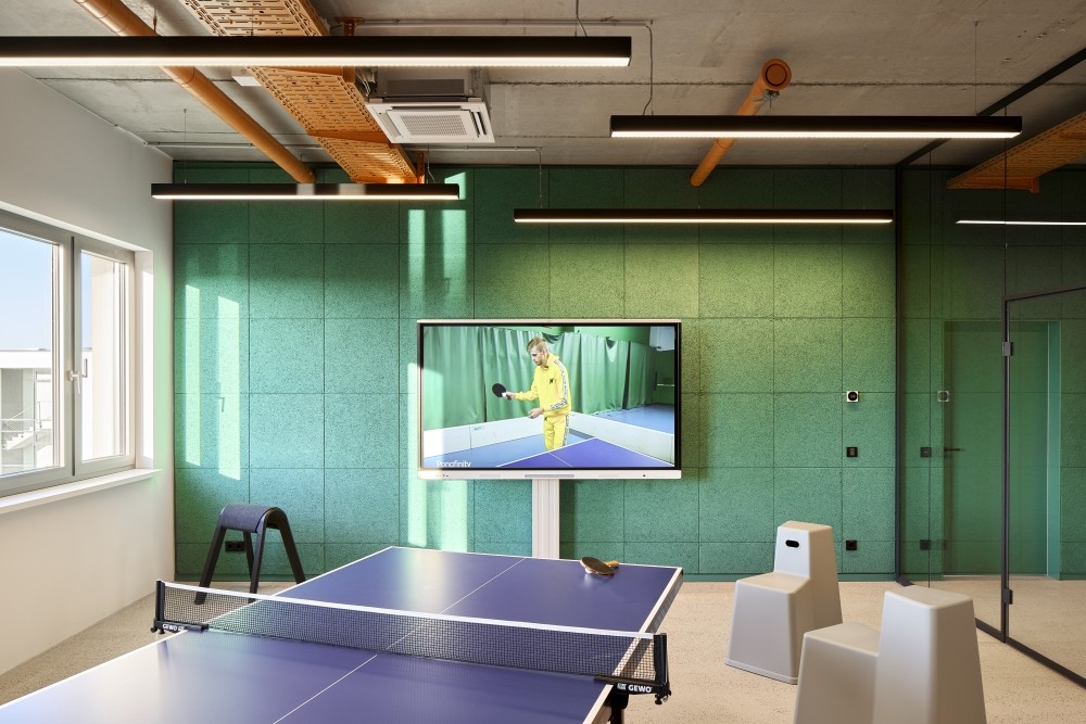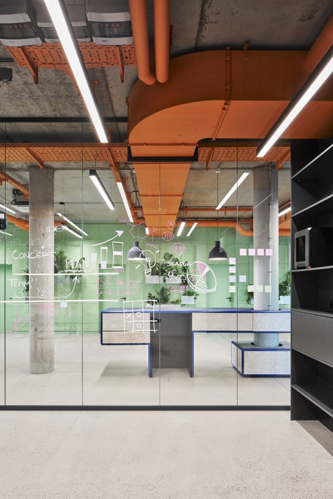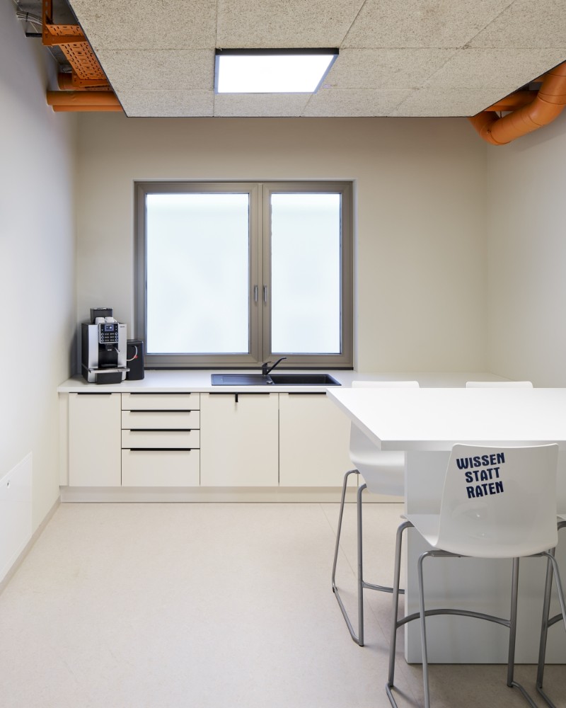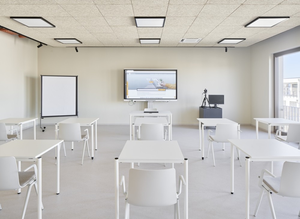Der Grund­riss des Roh­baus wur­de bewusst geglie­dert: Kon­zen­trier­te Grup­pen­ar­beit wur­de mit offe­nen, trans­pa­ren­ten und fle­xi­blen Zonen kom­bi­niert. Um den zen­tra­len Emp­fangs- und Begeg­nungs­be­reich her­um befin­den sich drei farb­lich abge­setz­te Boxen, die für klas­si­sche Semi­nar­ar­beit genutzt wer­den kön­nen. Die­se Kon­zen­tra­ti­ons­räu­me sind mit digi­ta­len Medi­en aus­ge­stat­tet und farb­lich zurück­hal­tend gestal­tet. Die kom­mu­ni­ka­ti­ve, offe­ne Mit­te bleibt hoch­fle­xi­bel für wech­seln­de Nut­zer­pro­fi­le und schafft Auf­ent­halts­qua­li­tä­ten für den rea­len Aus­tausch. Tisch­ten­nis­plat­ten, beschreib­ba­re Glas­wän­de, offe­ne Rega­le und ein zen­tra­les, anpass­ba­res Raum­mo­dul für Bewir­tung, Gesprä­che oder Prä­sen­ta­tio­nen för­dern agi­les Ver­hal­ten und frei­es Den­ken. Der Kon­trast aus Roh­bau- Charme und fei­nen Ober­flä­chen schafft Klar­heit: ein far­bi­ger Tech­nik­him­mel vor Beton oder geschlif­fe­ner Est­rich neben akus­ti­scher Wand­ver­tä­fe­lung der Semi­nar­be­rei­che. Pflan­zen­bal­ko­ne bil­den den wei­chen Gegen­pol zur hoch­in­stal­lier­ten 3-D-Dru­cker- Samm­lung. Die­se Bipo­la­ri­tät prägt die Lern­um­ge­bung und spie­gelt die Aus­gangs­punk­te jeder Dis­kus­si­on oder Markt­be­trach­tung wider. Die Farb- und Mate­ri­al­wahl wirkt modern, jung und anspruchsvoll.