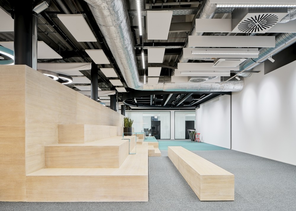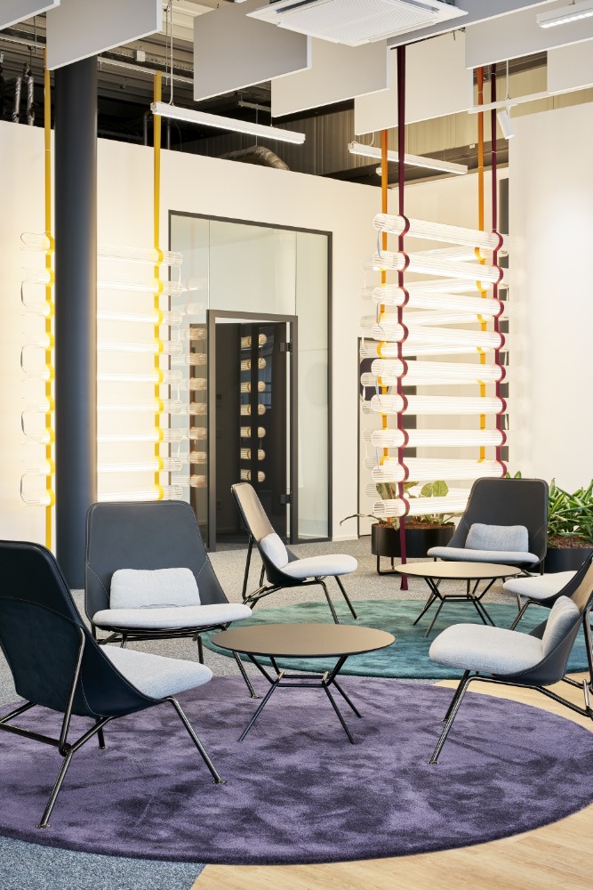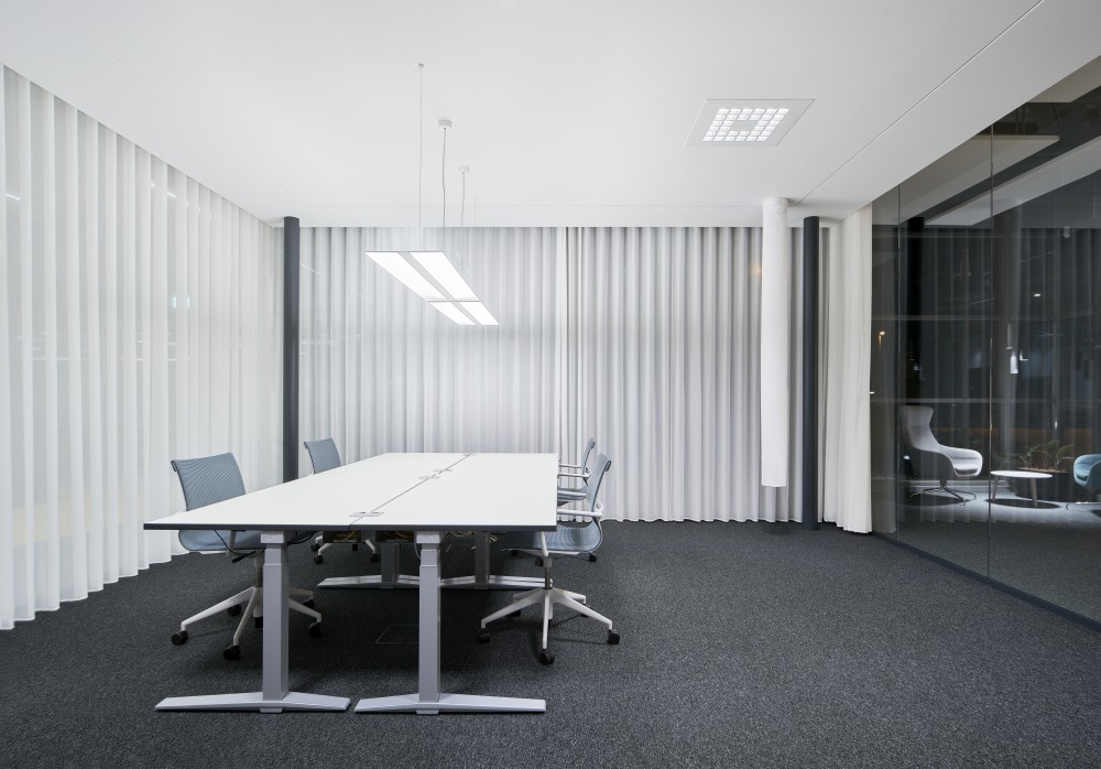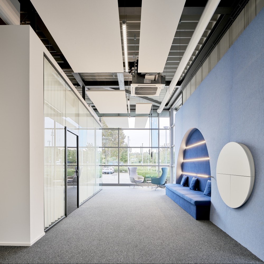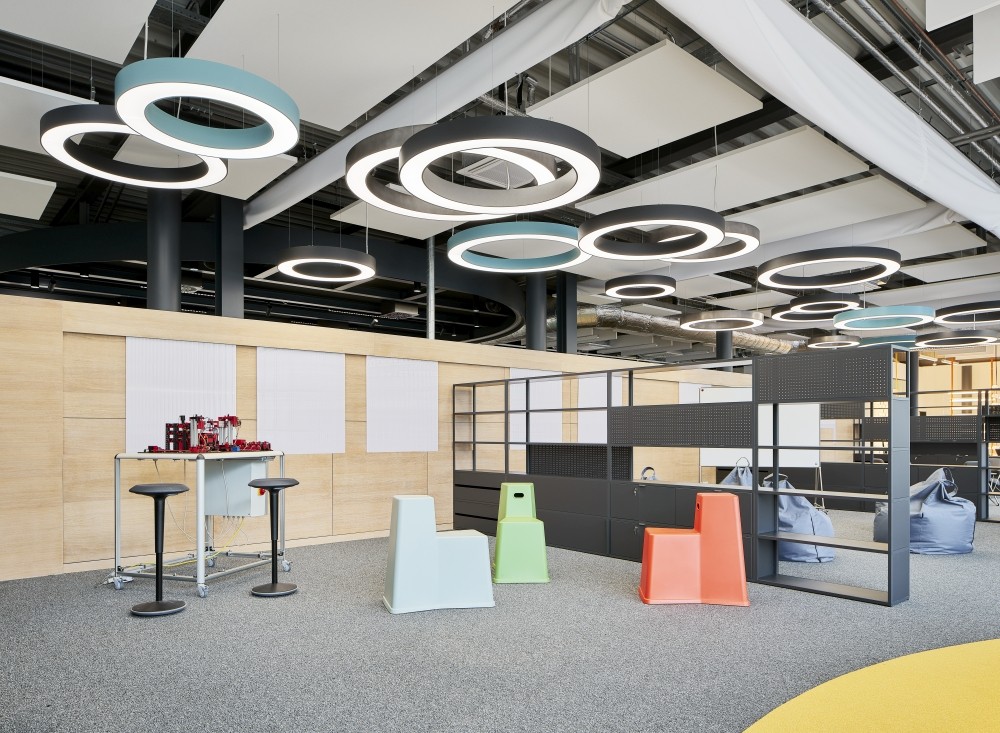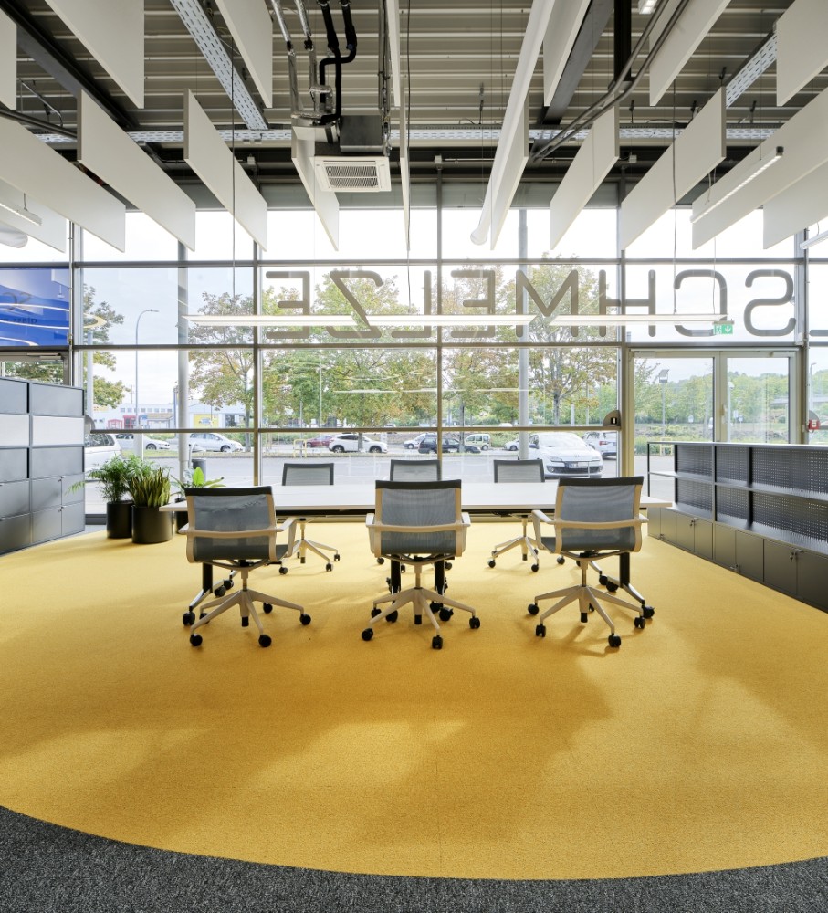 Der ehemalige Werksverkauf für Cerankochfelder im Gebäude B5 der Mainzer Schott AG wurde in eine vielseitige Kommunikations- und Arbeitswelt umgestaltet. An der Schnittstelle zwischen Werksgelände und der Mainzer Neustadt gelegen, ist sie für interne und externe Personen gleichermaßen zugänglich. Durch die unmittel- bare Zugänglichkeit und Sichtbarkeit bildet sie die physische Verbindung für offenen Austausch. Dauerarbeitsplätze der IT, temporäre Plätze für projektbezogene Teams und Gäste, Workshop- Bereiche, Thinktanks, Besprechungsräume und eine für Vorträge nutzbare Sitztribüne bilden das Rückgrat dieser neuen Arbeitswelt. Hier werden Arbeitsweisen und Raumbedarfe untersucht und analysiert, um aus den Ergebnissen unternehmensspezifische Anforderungen für zukünftige Umgestaltungen zu entwickeln.