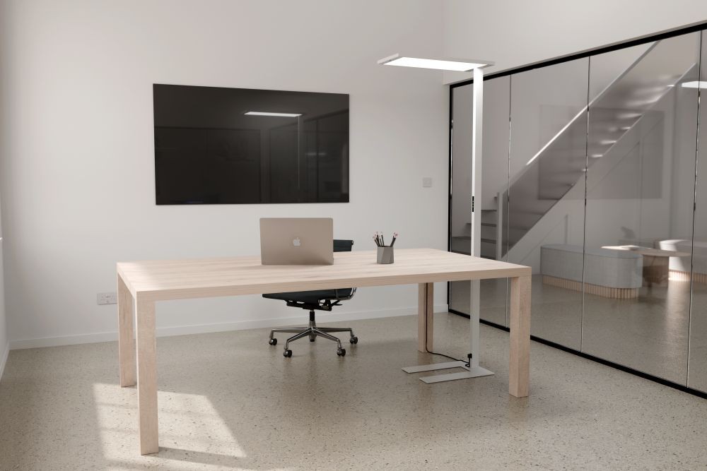 LUCEOS VON TRILUX: Die Steh­leuch­te ist vom Leuch­ten­kopf bis zum Stand­fuß indi­vi­du­ell kon­fi­gu­rier­bar. Dank steu­er­ba­ren Direkt- und Indi­rek­t­an­tei­len spen­det sie norm­ge­rech­tes Licht für die Bild­schirm­ar­beit und erhellt zudem den Raum. Gemacht für jede Arbeits- und Bürosituation.