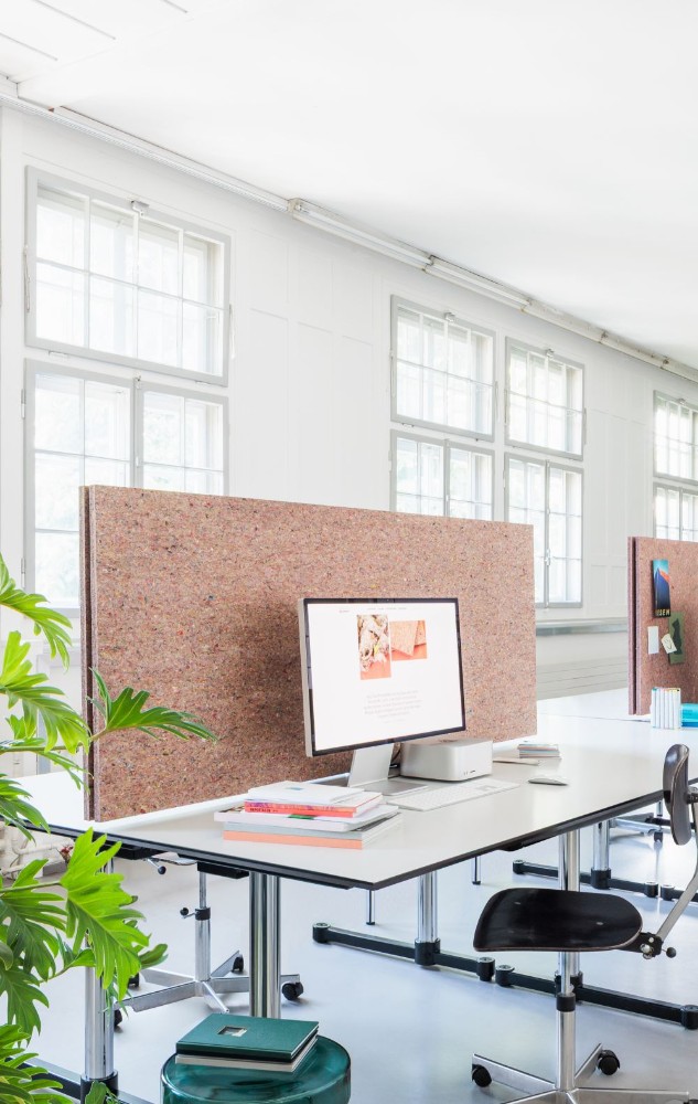 ABSORBER RECYCLED VON CRÉATION BAUMANN: Die form­sta­bi­len Absor­ber­plat­ten bestehen aus sor­ten­rein getrenn­ten Tre­vi­ra-CS-Rest­tex­ti­li­en. Die nach­hal­ti­gen Absor­ber mit hoher akus­ti­scher Wirk­sam­keit, getes­tet nach DIN EN ISO 354:2003, und der sicht­ba­ren Textil­struktur ver­lei­hen Büros eine leben­di­ge Ästhetik.