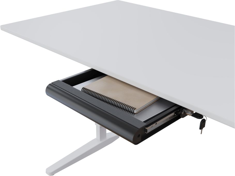 ADDIT S 633 VON DATAFLEX: Die abschließ­bare Sicher­heits­schub­la­de schützt Note­books, Tablets oder Smart­phones vor unbe­fug­tem Zugriff. Sie wird unter dem Schreib­tisch mon­tiert. Ihr per­fo­rier­ter Boden ermög­licht Luft­zir­ku­la­ti­on, wäh­rend rück­sei­ti­ge Öff­nun­gen den Anschluss von Daten- und Strom­ka­beln erlau­ben. Safe und smart.