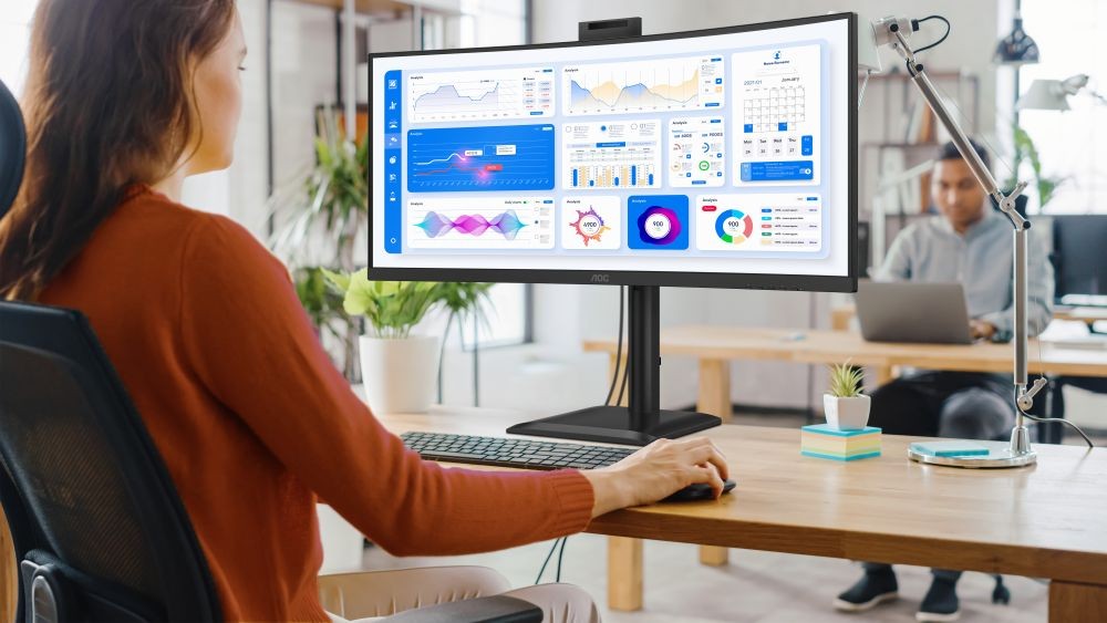 CU34E4CV VON AOC: 34-Zoll-Bildschirmdiagonale, 21:9-Seitenverhältnis, 120 Hz Bildwiederholfrequenz sowie ein Hardware-Blaulichtfilter – das ist hier die Basis für effizientes Arbeiten. Abgerundet wird das Gesamtpaket durch einen 90-W-USB-C-Port (PD) und das elegante Design des Monitors.