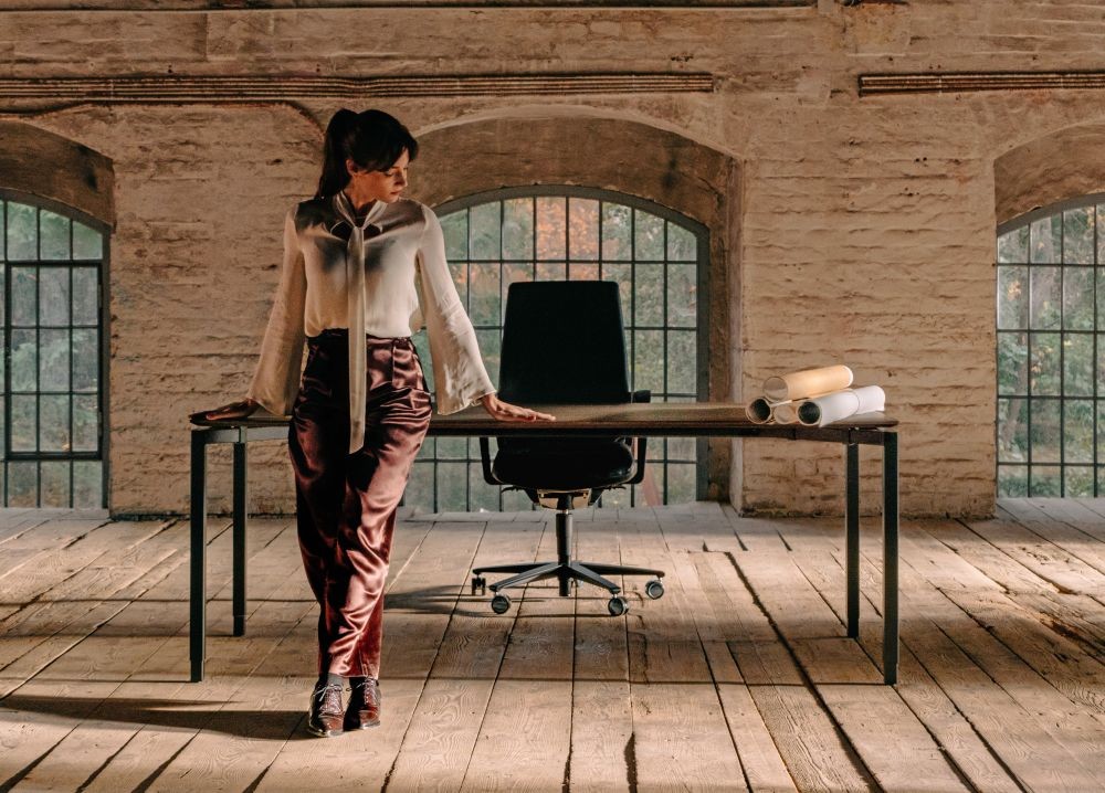 FLUX M VON NEUDOERFLER: Der Vier-Fuß-Schreibtisch ist elektrisch oder stromlos höhenverstellbar. Optional mit „Schweizer Kante“, einer abgeschrägten Unterseite der Tischplatten kante. Flux M ist ein klares optisches Statement auf vier Beinen mit ergonomischer Note.
