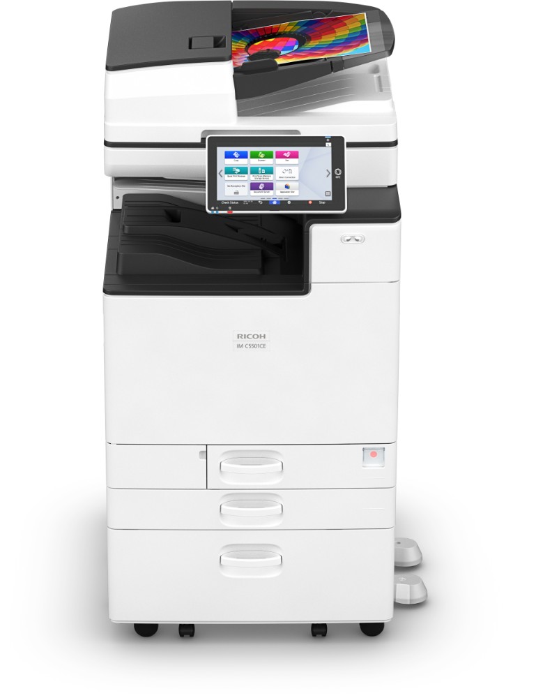 IM C5501CE VON RICOH: Das A3-Farb-Multifunktionssystem druckt bis zu 55 Seiten pro Minute. Bedient wird es per 10,1-Zoll-Smart-Operation-Panel. Der Fokus liegt aber auf der Nachhaltigkeit: Der MFP wird aus über 86 Prozent wiederverwendeten Komponenten gefertigt. Die Umwelt sagt Danke.