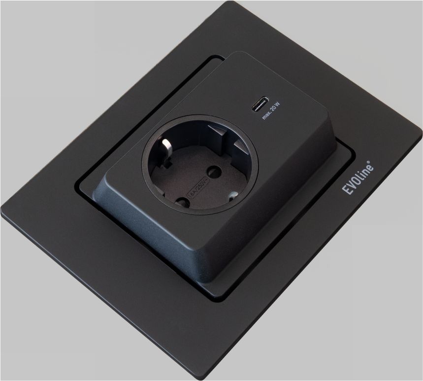 SPIN VON EVOLINE: Kernstück dieser Elektrifizierungslösung ist ein 180-Grad-Drehmechanismus. Dieser lässt die Strom -anschlüsse – von einer internationalen bzw. Euro-Steckdose bis zum USB-C-Charger – bei Nichtgebrauch verschwinden. Einfach per „Fingertap“. Fast magisch, echt elektrisierend. Spin me around.