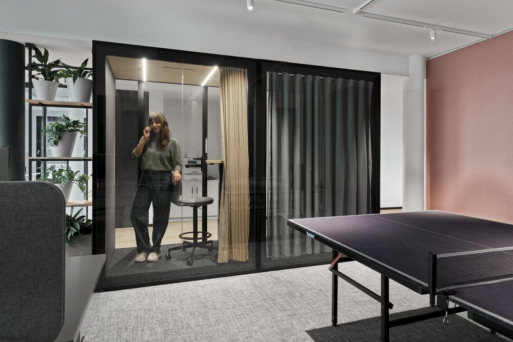BA-FOCUS VON BERLIN ACOUSTICS: Auf einer Fläche von 1 m2 kann ungestört (video-)telefoniert werden. Ein 4,5 cm dicker Akustikfilz sowie ein Doppelboden mit Teppich-fliesen wirken schallabsorbierend. LED-Beleuchtung, die beim Betreten der Telefonbox aufleuchtet, und ein geräuscharmes Belüftungssystem ermöglichen fokussiertes und ablenkungsfreies Arbeiten mit Komfort. So geht Hybrid Work heute.