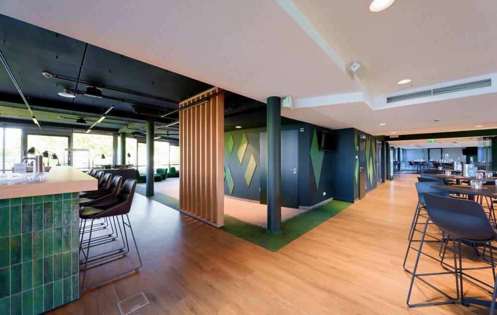 AXIS UND RADIUS VON GÖTESSONS: Die schallabsorbierenden Deckenplatten, ummantelt mit Hush-Textil und montierbar auf T24-Trägersystemen, verleihen dem Office einen lebendigen Touch. Wer geradlinige Muster bevorzugt, greift zu Tiles Axis, für runde Muster zu Tiles Radius. Hier trifft Akustik- auf Designkompetenz.