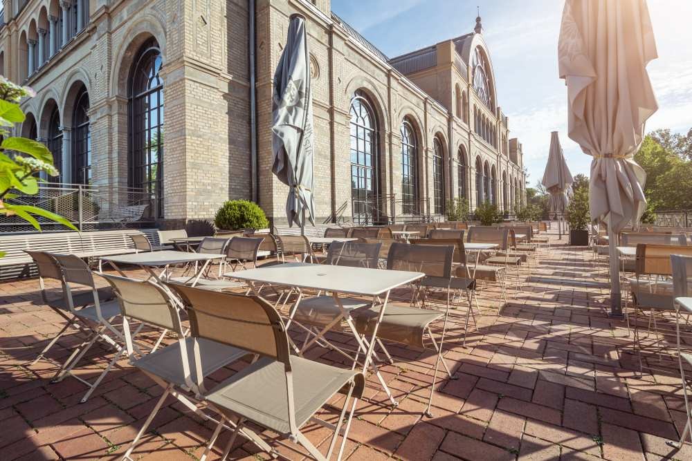 Fermob gestaltet Orte, an denen Menschen gern zusammenkommen. Abbildung: Kastaniengarten im Rheinhotel Dressen, Bonn-Bad Godesberg