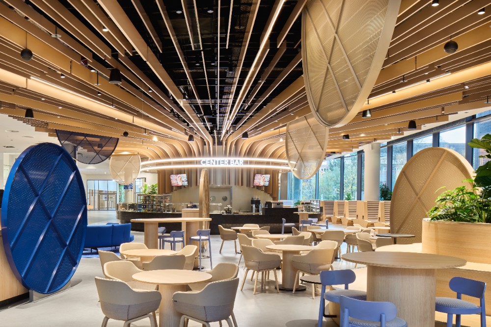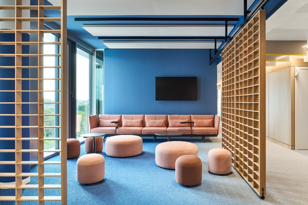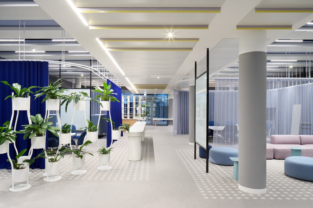 Eingebettet in den Unternehmenspurpose „Care Beyond Skin“ steht das Wohlbefinden jedes Einzelnen im Fokus, der in interdisziplinären Teams sein volles Potenzial entfalten kann. Ein Angebot an vielfältigen Raumkonfigurationen und Formaten unterstützt diese Neuausrichtung hin zum agilen Arbeiten. Kommunikation, Kollaboration, Konzentration und Kontemplation: Die neue Arbeitswelt bietet für die jeweilige Tätigkeit eine optimale Umgebung. Ein choreografierter Kanon von Raummodulen für fokussiertes Arbeiten und Rückzug, diskrete und informelle Gespräche im Sitzen oder Stehen, konzentrierte Kontemplation im Liegen, kleine Workshops und große Präsentationen oder eben auch für spontane Meetings und Coworking-Situationen zieht sich durch den gesamten Neubau – und bildet so eine intelligente Landschaft mit einer hohen Angebotsstruktur.