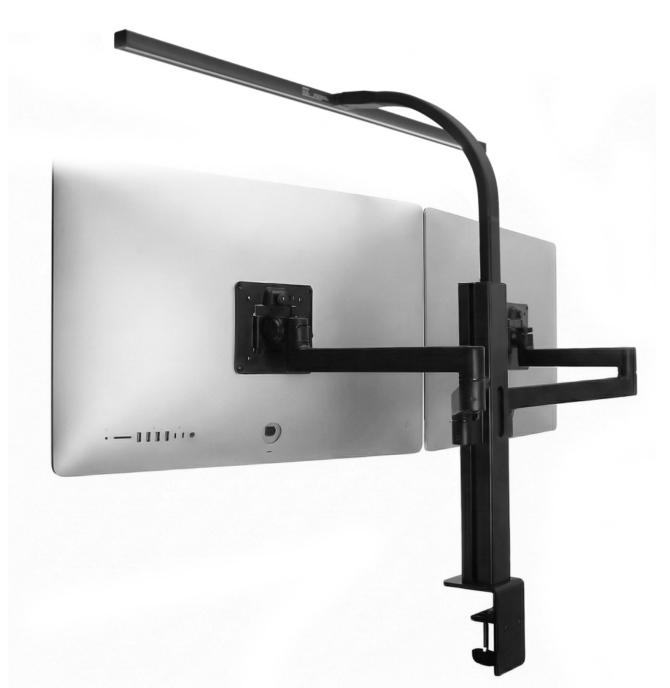 AXIO VON UNILUX: Der Dop­pel­mo­ni­tor­trag­arm ist für Bild­schirm­grö­ßen von 13 bis 36 Zoll aus­ge­legt – mit einem maxi­ma­len Gewicht von 10 kg je Moni­tor. Auf­grund sei­ner modu­la­ren Kom­po­nen­ten, wahl­wei­se mit Gas­fe­der- oder mecha­ni­schem Arm, passt er sich an indi­vi­du­el­le Nut­zer­be­dürf­nis­se an. Pfif­fig: Er kann mit der Schreib­tisch­leuch­te Eli­te Lumi­no von Uni­lux (#52) kom­bi­niert wer­den. Ein dyna­mi­sches Duo.