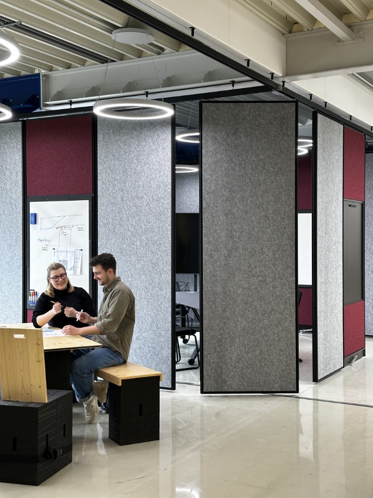 Dabei punktet vor allem die Anpassungsfähigkeit des zum Patent angemeldeten Systems Flomo Wall Plus: Die Schiebewandelemente lassen sich werkzeuglos verschieben und neu konfigurieren – intuitiv durch die Nutzer selbst. Dank innovativer Kreuzungspunkte können die Wandelemente sogar über Eck bewegt werden. Gleichzeitig sorgt die deckengeführte Konstruktion ohne Bodenschienen für maximale Bewegungsfreiheit im Arbeitsalltag. Mit einer durchdachten Aufhängung konnten die Deckenschienen trotz der großen Höhenunterschiede in der alten Fabrikhalle realisiert werden.