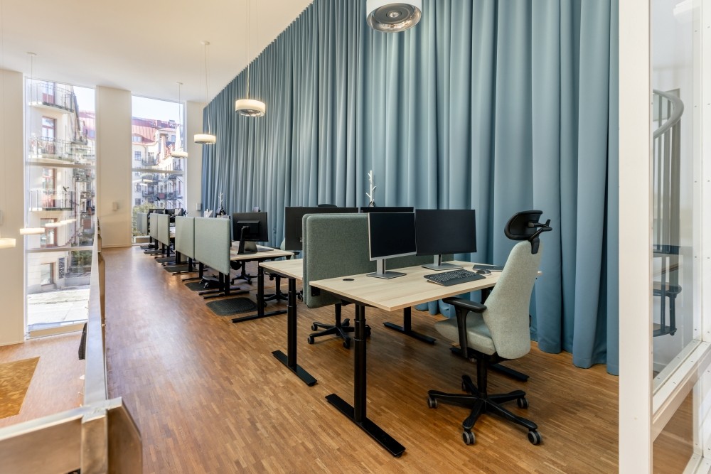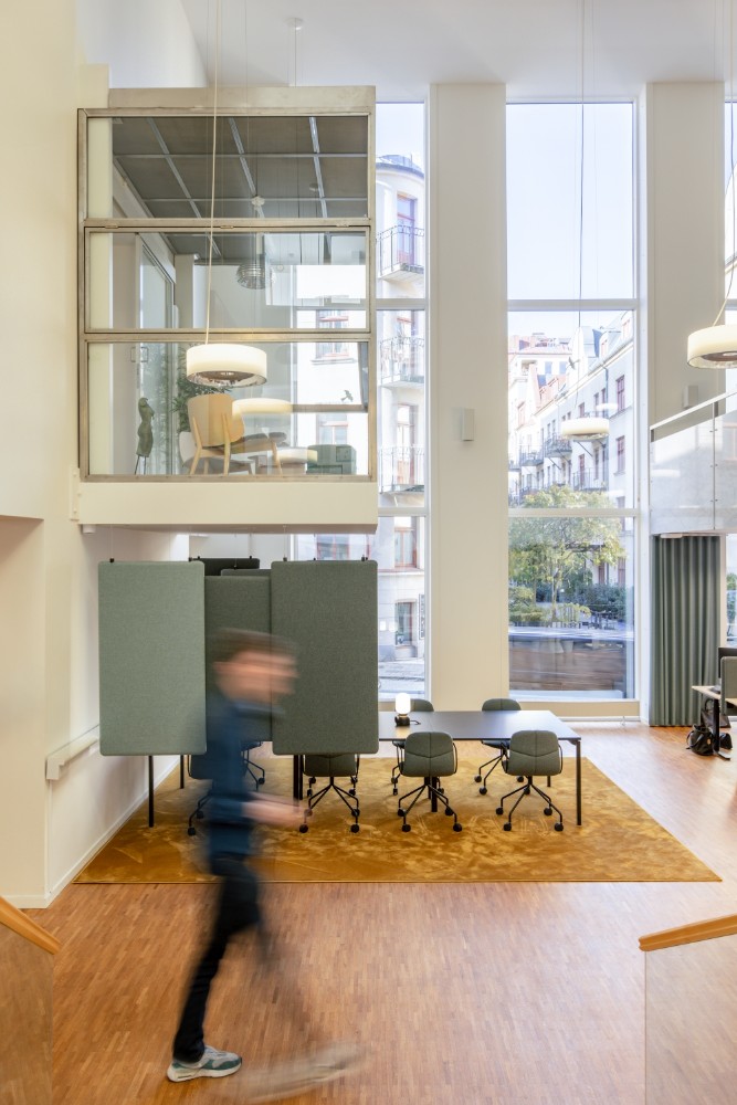 Eine der Herausforderungen bestand darin, in den weitläufigen, offenen Räumen eine Umgebung zu gestalten, die ein Gleichgewicht zwischen individueller Arbeit, Besprechungen und kreativer Zusammenkunft schafft. Die Raumhöhe des Kirchengebäudes stellte zudem enorme Anforderungen an die Akustik. Auf der schon zuvor als Büro genutzten Fläche waren aufgrund der durch den Hall verstärkten Geräuschkulisse Konzentrationsschwierigkeiten und Kopfschmerzen bei den Mitarbeitenden aufgetreten. Um die akustische Umgebung zu verbessern, setzte Kinnarps auf individuell angepasste Lösungen. Strategisch platzierte Schallabsorber, Polstermöbel, Teppiche und Vorhänge wurden eingesetzt, um den Geräuschpegel signifikant zu reduzieren. Besonders das Erdgeschoss profitiert von schallabsorbierenden „Vibe“-Screens, die von der ehemaligen Kanzel herabhängen und einen eigenen Arbeitsbereich bilden.