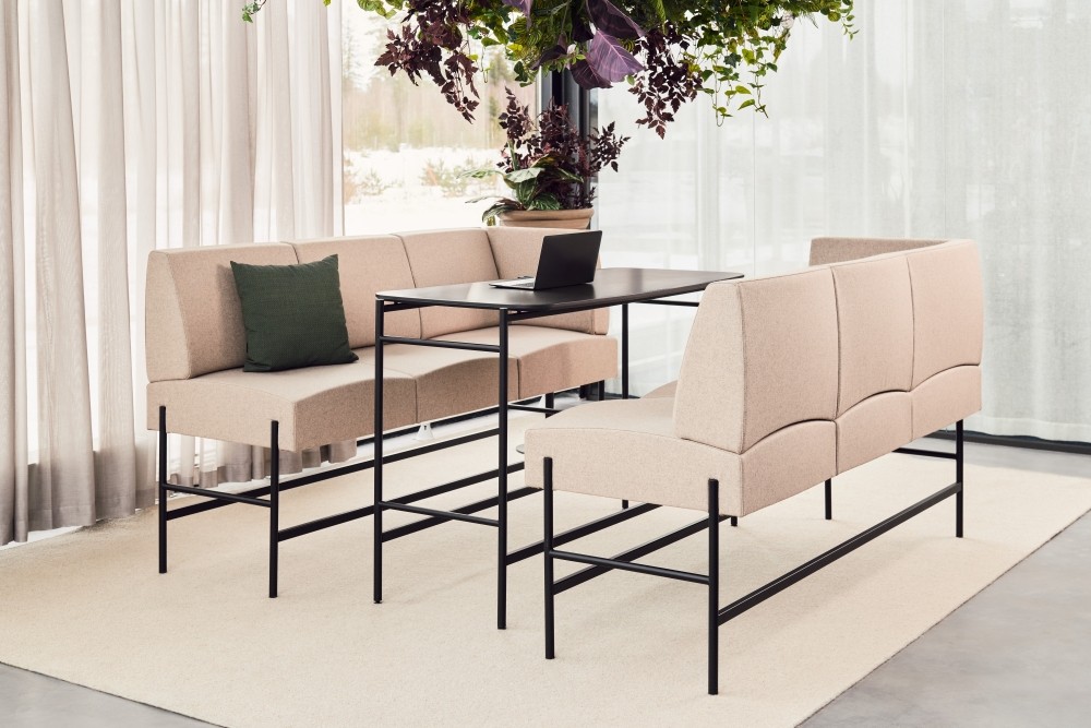 ON VON GÖTESSONS: Die Soft-Seating- und Tischkollektion hat der Produktdesigner und Professor für Möbeldesign Sigurd Strøm entworfen. Dank der modularen Bauweise und der zwei verschiedenen Höhen lassen sich Office- und Hospitality-Zonen variantenreich ausstatten, vom Besprechungsraum über Aufenthalts- und Pausenbereiche bis hin zu wohnlichen Umgebungen. Die Polsterung aus Formschaum und die großzügige Sitztiefe von 50 cm ermöglichen ein so bequemes wie entspanntes Sitzgefühl. Ein weiteres Plus: Einzelne Module der Sitzflächen und Rückenlehnen lassen sich auswechseln. So muss nicht das komplette Sofa ausgetauscht oder repariert werden. Die ökologische Nachhaltigkeit bezeugt ein Möbelfakta-Zertifikat.