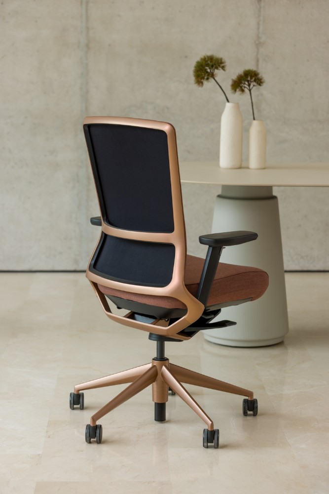 TNK 500 AUREA VON ACTIU: Die Neuauflage des ikonischen Bürostuhls von Alegre Design verfügt über eine Gestellstruktur aus Aluminium. Diese wurde für das neue Modell technisch weiterentwickelt, um die Haltbarkeit, Leichtigkeit und Stabilität des Sitzmöbels zu verbessern. Die metallischen Farben erzeugen einen einzigartigen Look, der skulptural und erhaben wirkt. Wirklich sehr schick. Der TNK 500 Aurea ist aber nicht nur optisch, sondern auch ergonomisch auf einem sehr hohen Niveau. Die intelligente Rückenlehne passt sich automatisch den Bewegungen des Be-Sitzers an, stützt die Lendenwirbelsäule kontinuierlich und fördert so eine gesunde Körperhaltung während langer Arbeitstage.