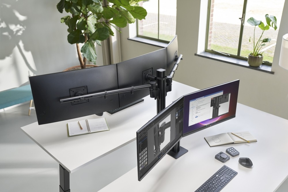 VIEWGO MODULAR VON DATAFLEX: Das Multi- Monitor-System ist dank seiner Modularität und seines klaren Designs ein echtes Highlight, das seine Aufgaben dezent im Hintergrund erledigt. Da der Monitortragarm auf einer Säule basiert, kann er Schritt für Schritt problemlos und flexibel an unterschiedliche Arbeitsplatztypen angepasst werden, ohne bestehende Konfigurationen zu ersetzen. Das parabolische Design unterstützt eine natürliche Blickführung und ergonomische Bildschirmarbeit. Adapter für Säulen, Wände und Schienensysteme ermöglichen vielseitige Installationen und schaffen eine strukturierte, funktionale Arbeitsumgebung. Ein Held des Büroalltags, der in jedem Office Wichtiges leistet.